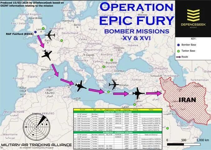 从英国起飞的四架B1B战略轰炸机,前后需要12架加油机支援以轰炸伊朗,这些由欧洲的加油机队负责