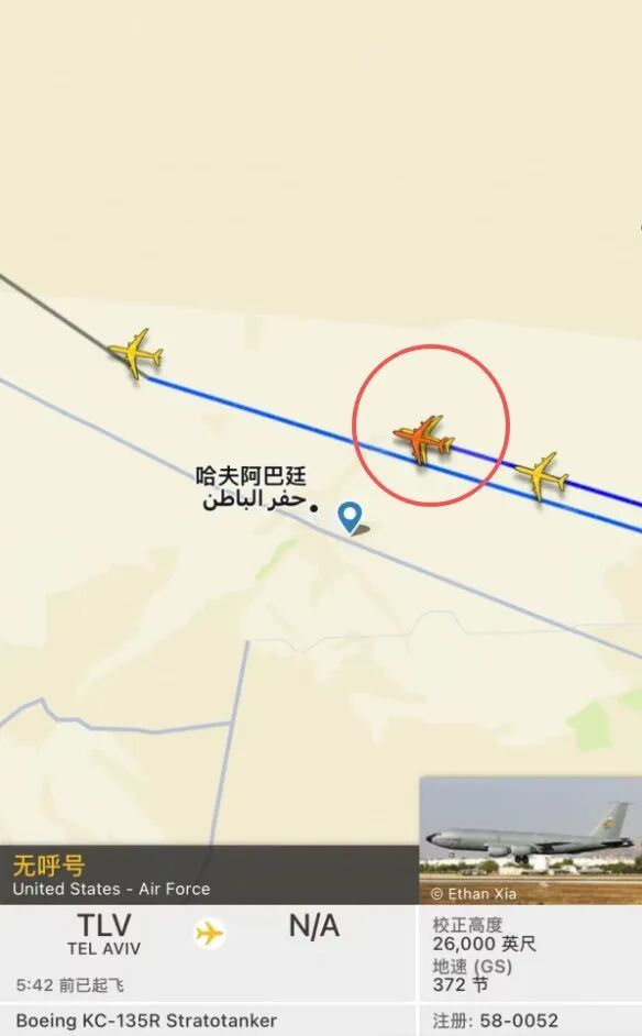 从这架没关应答机的KC135飞行轨迹,我们可以看出其从特拉维夫起飞后,就沿着沙特与伊拉克边境飞往波斯湾上空,并在波斯湾上空建立加油区。在完成加油任务后再返回特拉维夫,前后耗时七八个小时。
