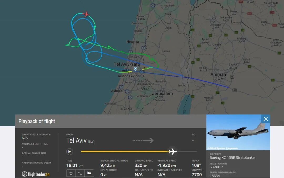 事故KC135是当地时间下午一点半起飞并执行战区加油任务,并在晚上八点半成功降落。降落之前在东地中海上空盘旋多圈,推测是将机内油量消耗殆尽以降低受损飞机降落时的风险。考虑到相撞的位置在伊拉克西部靠近约旦边境,那么从时间倒推来看,碰撞可能发生在以色列时间晚上六点半左右。这时候细心的朋友已经发现了,相撞发生在完成加油任务后返航的过程中,并且已经执行了7小时的任务。