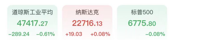美国股市周三涨跌互现,投资者谨慎关注中东局势与油价飙升,同时关注最新通胀数据。截至收盘,道指下跌289.24点,跌幅0.61%,收于47417.27点,纳斯达克综合指数小幅上涨0.08%,收于22716.13点。标普500指数微跌0.08%,收于6775.80点。